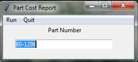 Part-Costs Summarizes the costs of manufacturing a part. A user enters a part number from our database and is returned the total average vs estimated cost of a part to see if it is profitable to produce a part at the current sell price.