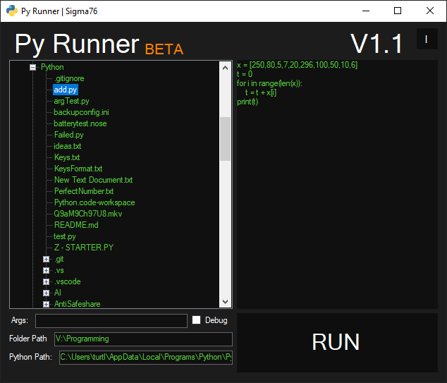 Python Runner A (rather stupid) program I made for someone to help with organizing / running Pyton scripts. [Main Window] [After Running a Python script through Py Runner]