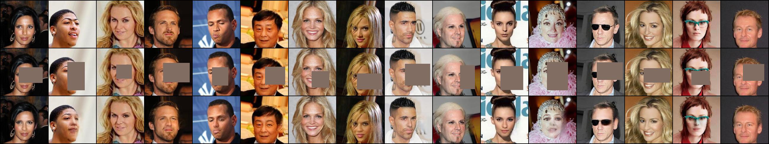 python train.py datasets/dataset/ results/result/ [--data_parallel (store true)] [--cn_input_size (int)] [--ld_input_size (int)] [--init_model_cn (str)] [--init_model_cd (str)] [--steps_1 (int)] [--steps_2 (int)] [--steps_3 (int)] [--snaperiod_1 (int)] [--snaperiod_2 (int)] [--snaperiod_3 (int)] [--bsize (int)] [--bdivs (int)]<dataset>(required): path to the dataset directory.<result>(required): path to the result directory.[--data_parallel (store true)]: when this flag is enabled, models are trained in data-parallel way. If N gpus are available, N gpus are used during training (default: disabled).[--cn_input_size (int)]: input size of generator (completion network). All input images are rescalled so that the minimum side is equal tocn_input_sizethen randomly cropped intocn_input_sizexcn_input_size(default: 160).[--ld_input_size (int)]: input size of local discriminator (default: 96). Input size of global discriminator is the same as[--cn_input_size].[--init_model_cn (str)]: path to a pretrained generator, used as its initial weights (default: None).[--init_model_cd (str)]: path to a pretrained discriminator, used as its initial weights (default: None).[--steps_1 (int)]: training steps during phase 1 (default: 90,000).[--steps_2 (int)]: training steps during phase 2 (default: 10,000).[--steps_3 (int)]: training steps during phase 3 (default: 400,000).[--snaperiod_1 (int)]: snapshot period during phase 1 (default: 10,000).[--snaperiod_2 (int)]: snapshot period during phase 2 (default: 2,000).[--snaperiod_3 (int)]: snapshot period during phase 3 (default: 10,000).[--max_holes (int)]: maximum number of holes randomly generated and applied to each input image (default: 1).[--hole_min_w (int)]: minimum width of a hole (default: 48).[--hole_max_w (int)]: maximum width of a hole (default: 96).[--hole_min_h (int)]: minimum height of a hole (default: 48).[--hole_max_h (int)]: maximum height of a hole (default: 96).[--bsize (int)]: batch size (default: 16). bsize >= 96 is strongly recommended.[--bdivs (int)]: divide a single training step of batch size = bsize into bdivs steps of batch size = bsize/bdivs, which produces the same training results as whenbdivs= 1 but uses smaller gpu memory space at the cost of speed. This option can be used together withdata_parallel(default: 1).