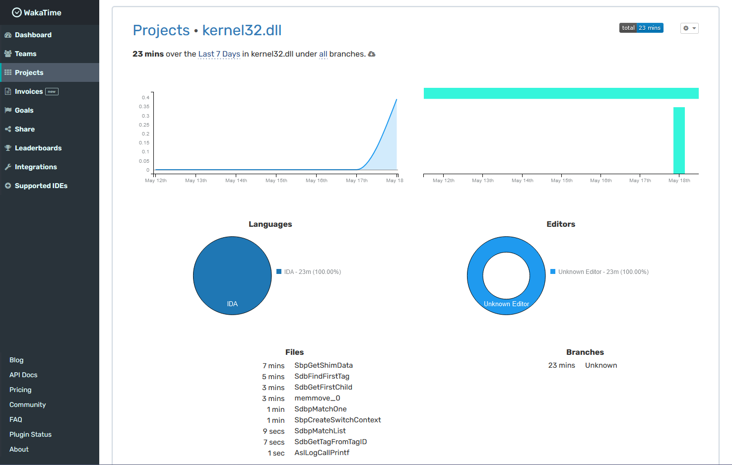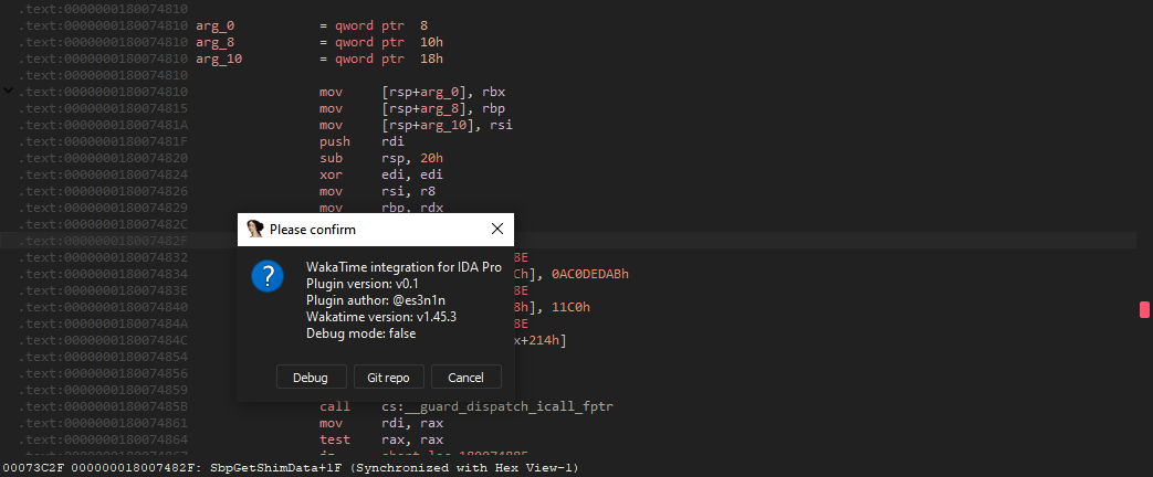 wakatime.pyto the directory$(IDA_PATH)/plugins - Start IDA Pro